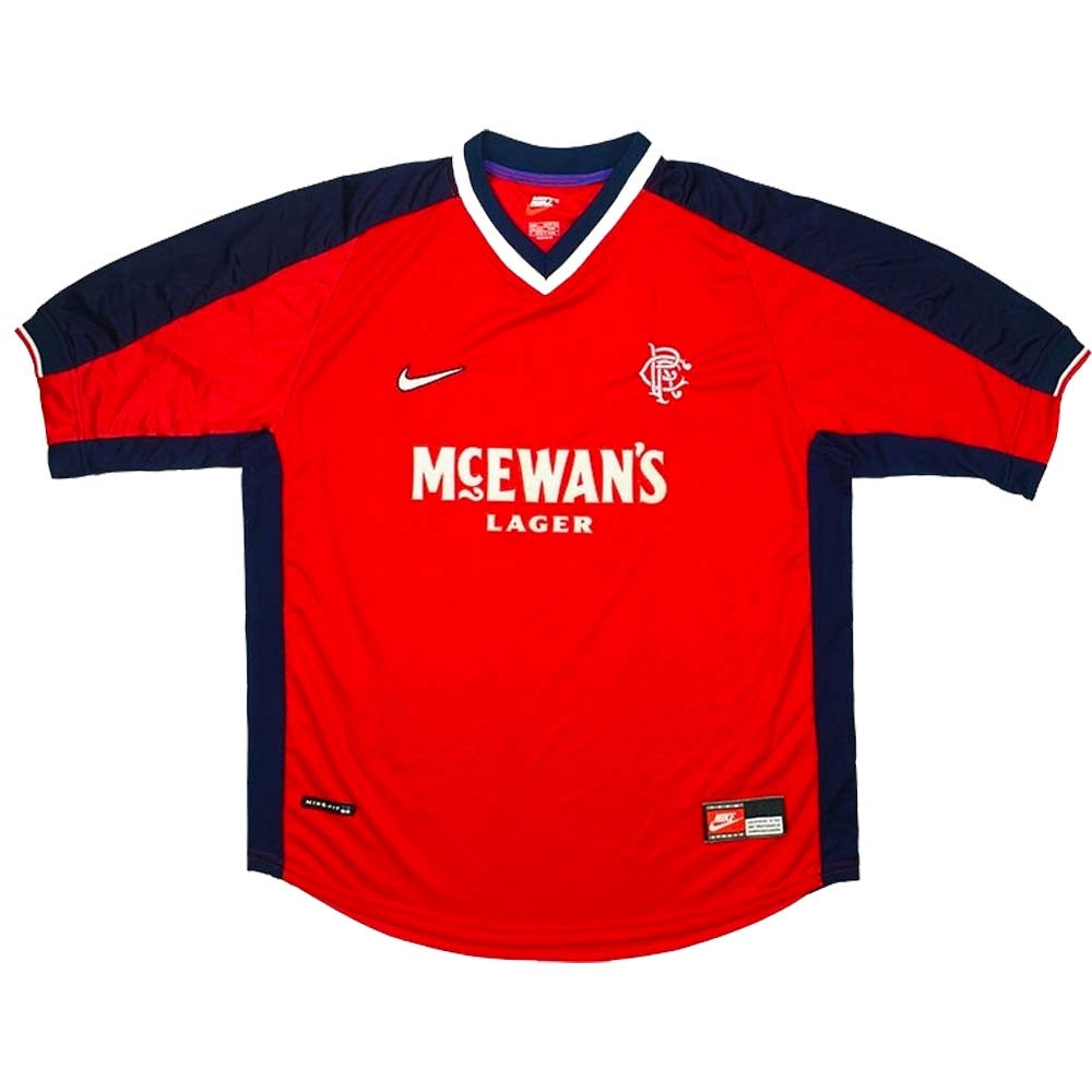 Excellent condition - Minimal signs of wear. Rich red colour. Sponsor felt is excellent. Badge is embroidered.Rangers 1998-99 away top as worn by Wallace, van Bronckhorst, Amoruso, Hendry, Albertz and Kanchelskis as the Gers secured a treble winning season.